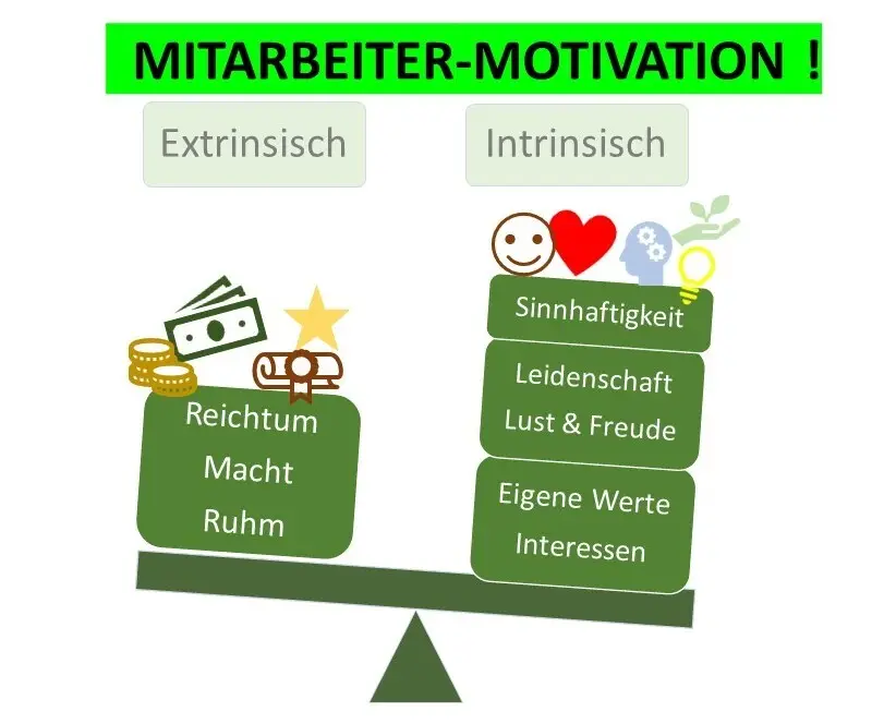 Eine ausgeprägtere Form der Motivation ist die Intrinsische Motivation. Diese entsteht, in Form von Interesse, Werte, Sinnhaftigkeit und Leidenschaft, in dem Arbeitenden selbst. Es gibt für Arbeitgeber Möglichkeiten, auch diese inneren Motivationen der Mitarbeiter von außen zu beeinflussen.