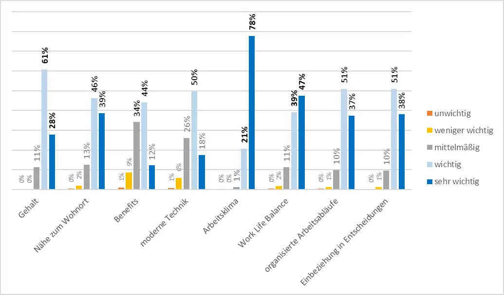 An erster Stelle steht das Arbeitsklima, das alle Befragten als wichtig oder sehr wichtig beurteilt haben. Dies ist direkt durch den Arbeitgebenden beeinflussbar und kostet nur wenig. An zweiter Stelle steht für 86 % aller Arbeitnehmenden die Work-Life-Balance. Mit einer Zustimmung von über 80 % sind Gehalt, organisierte Arbeitsabläufe, das Einbeziehen in Entscheidungen und die Nähe zum Wohnort ebenfalls wichtige Faktoren (Abb. 5).